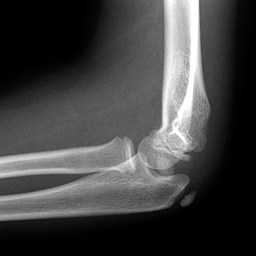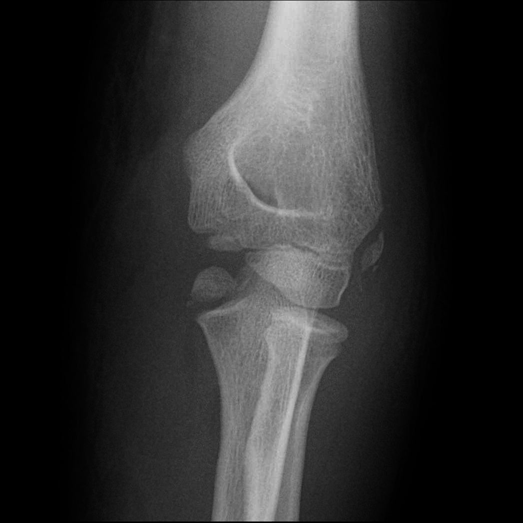 Welche wichtige, jedoch leicht zu übersehende Verletzung erkennen Sie auf diesem Ellenbogenröntgen eines 12-jährigen Patienten nach erfolgter Reposition einer vorangegangenen Ellenbogenluxation?