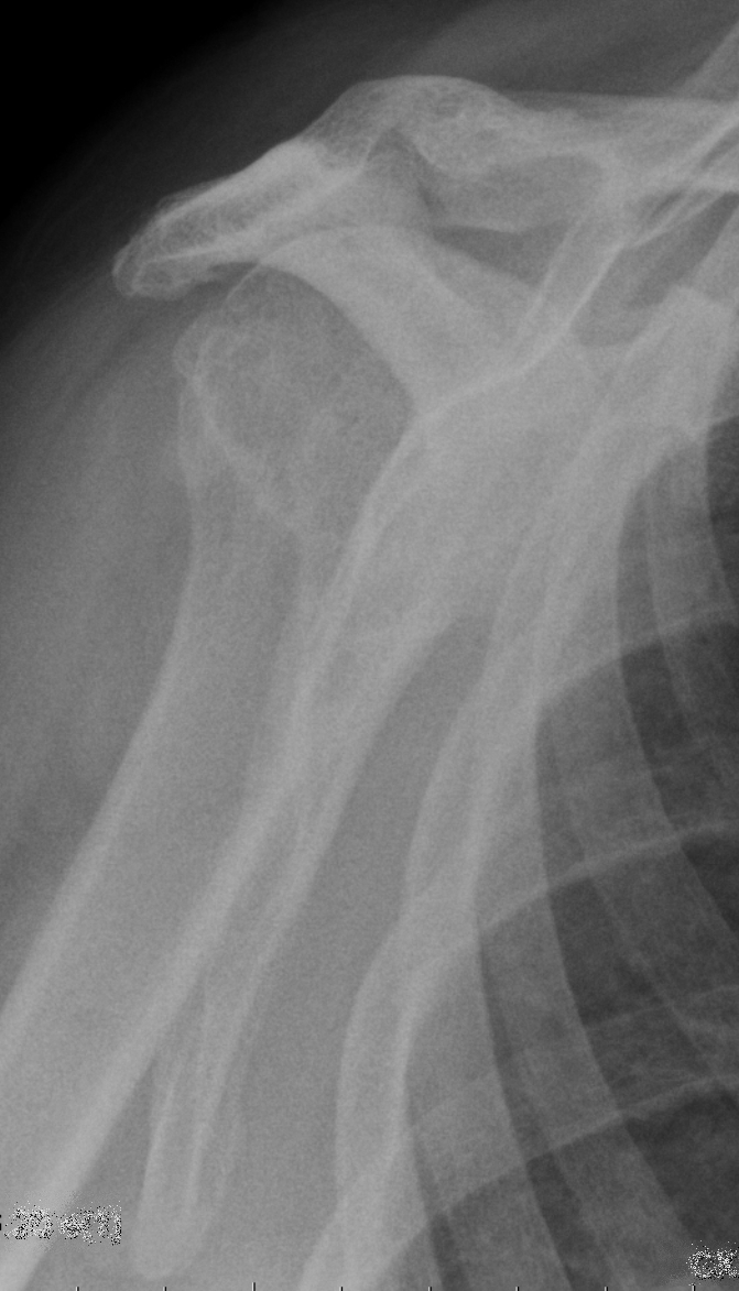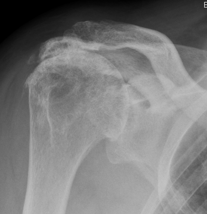 Beschreiben Sie die Befunde auf dem vorliegenden Röntgenbild der Schulter und geben Sie die wahrscheinlichste Ursache für die Befunde an.