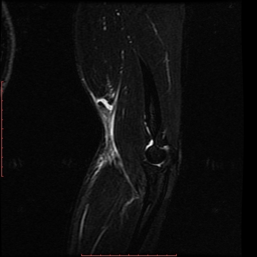 Anamnese: Ellenbogenschmerzen nach Gewichtheben. Welche Pathologie können Sie auf dem vorliegenden MRT des Ellenbogens erkennen?