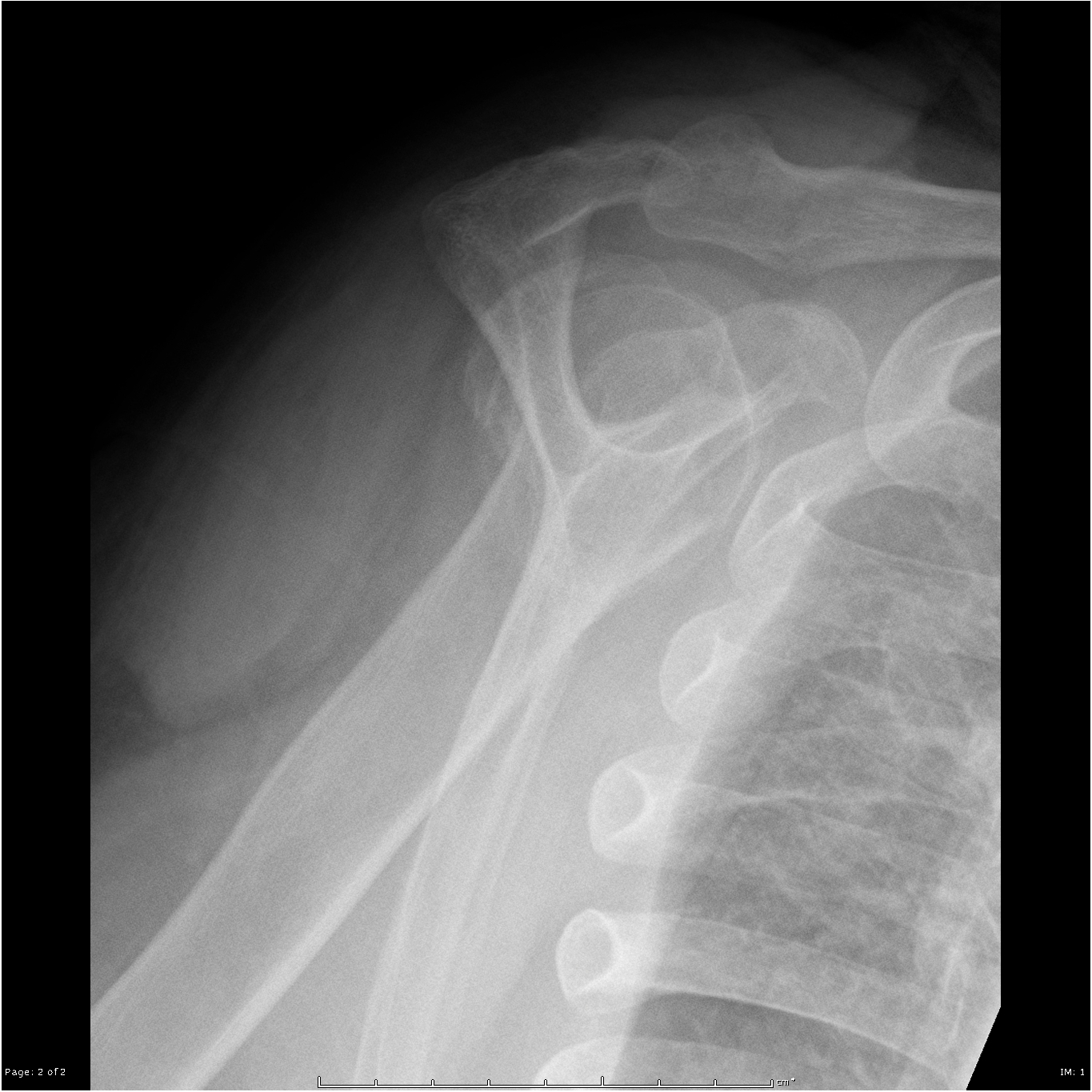 Beschreiben Sie die Befunde auf dem vorliegenden Röntgenbild der Schulter.