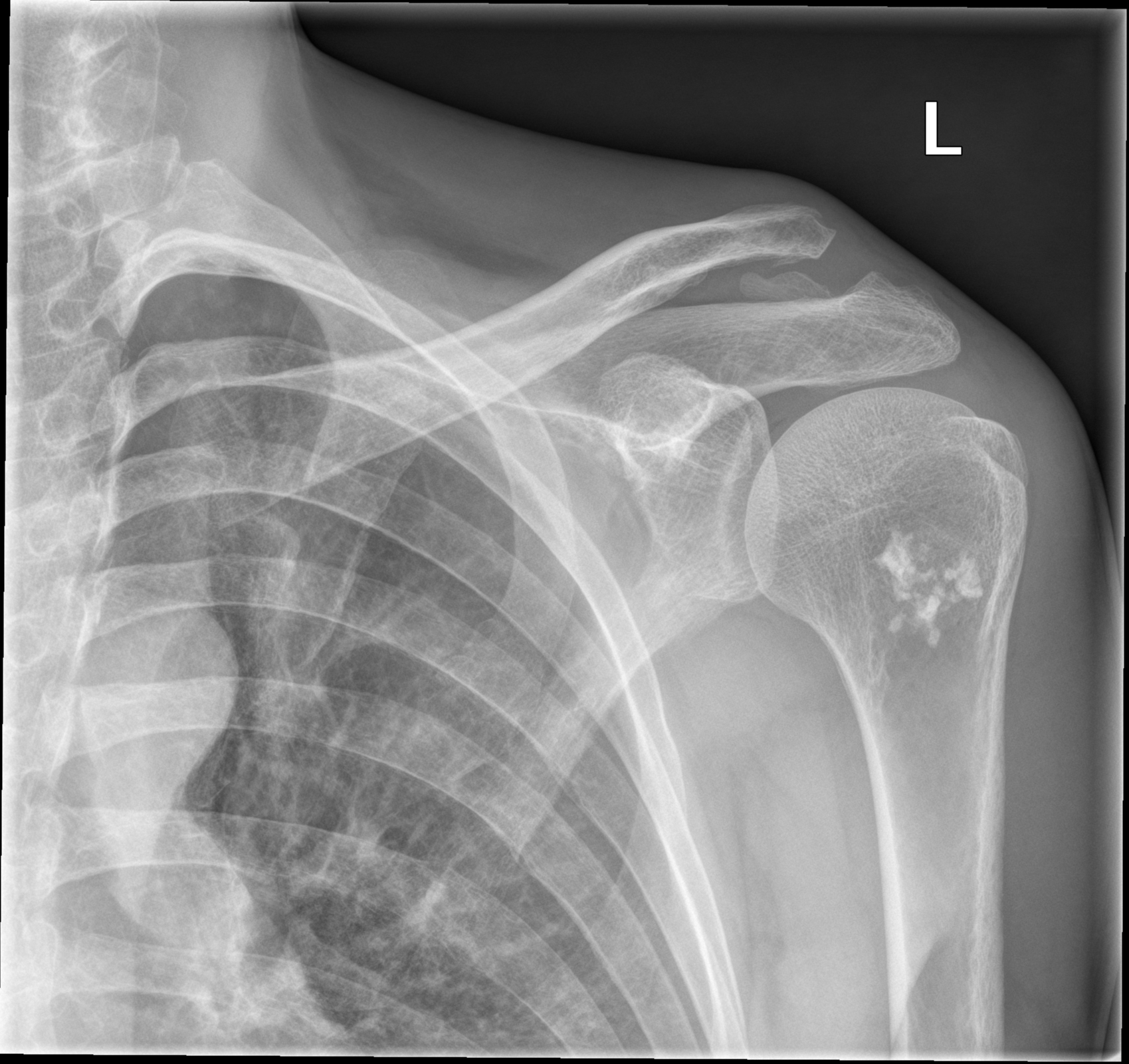 Welches ist die wahrscheinlichste Diagnose für die im vorliegenden Röntgen abgrenzbare Läsion des proximalen Humerus? DDs?