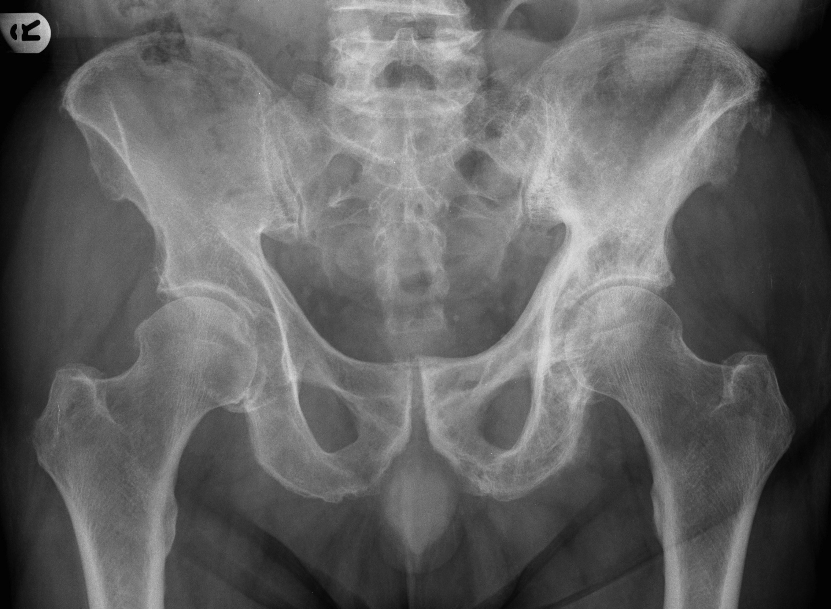Welche Befunde, passend zu welcher Pathologie zeigt das linke Hemipelvis auf dem vorliegenden Röntgenbild?