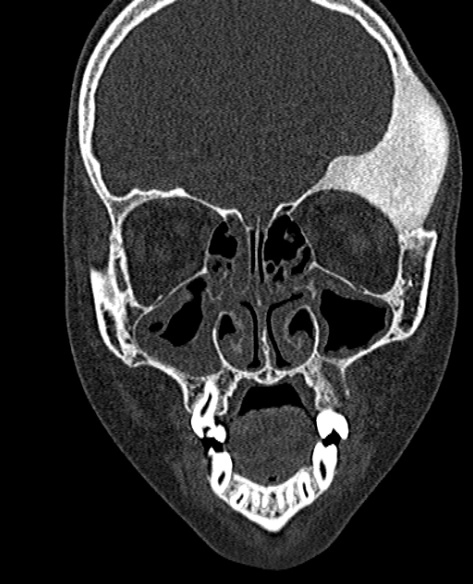 Welche Befunde erheben Sie auf dem vorliegenden Schädel-CT eines 10-jährigen Mädchens? Welche Diagnose ist am wahrscheinlichsten?
