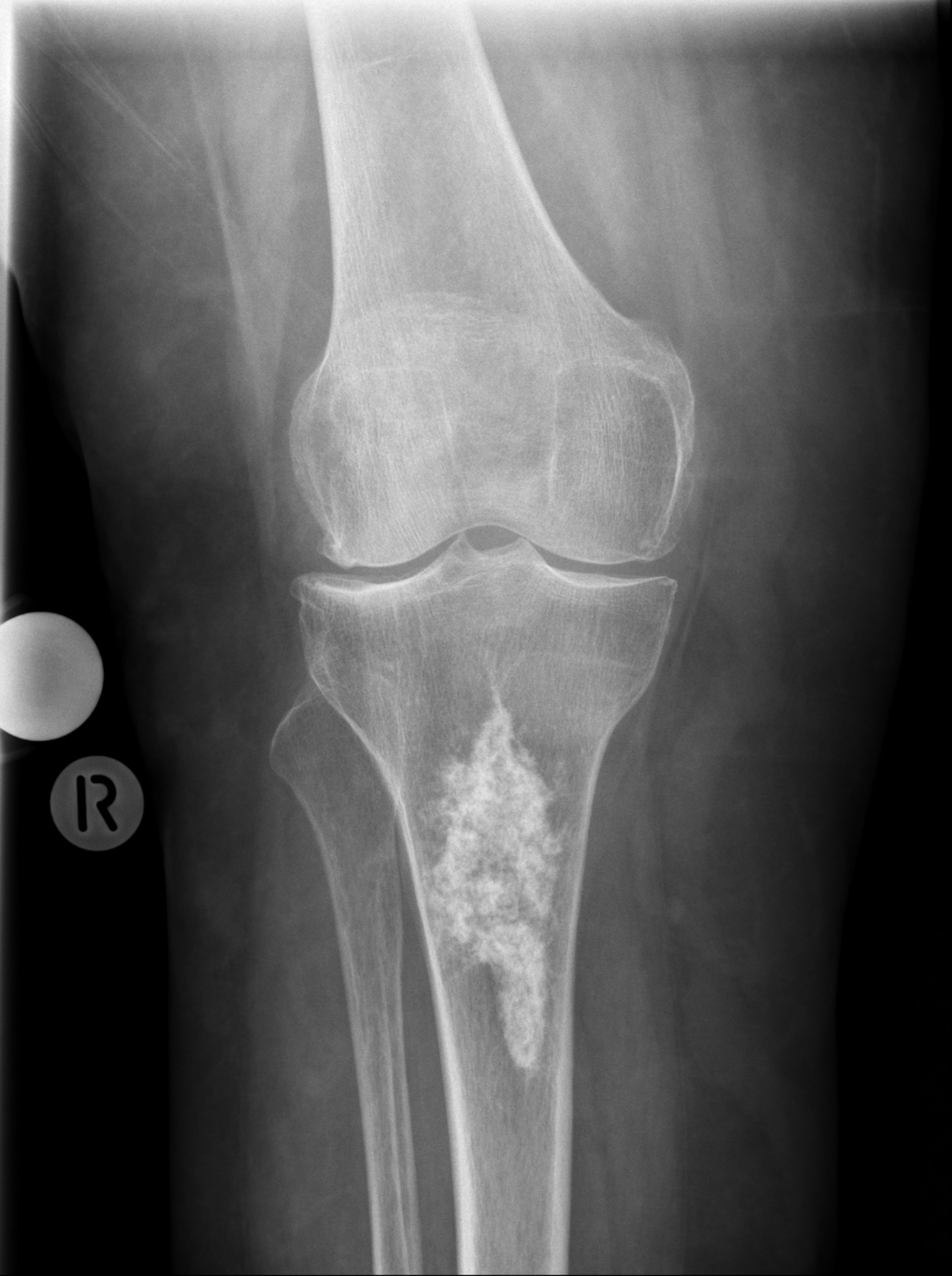 Worum handelt es sich bei der Läsion in der proximalen Tibia am ehesten? Demographische Daten: 75-jährige Patientin.
