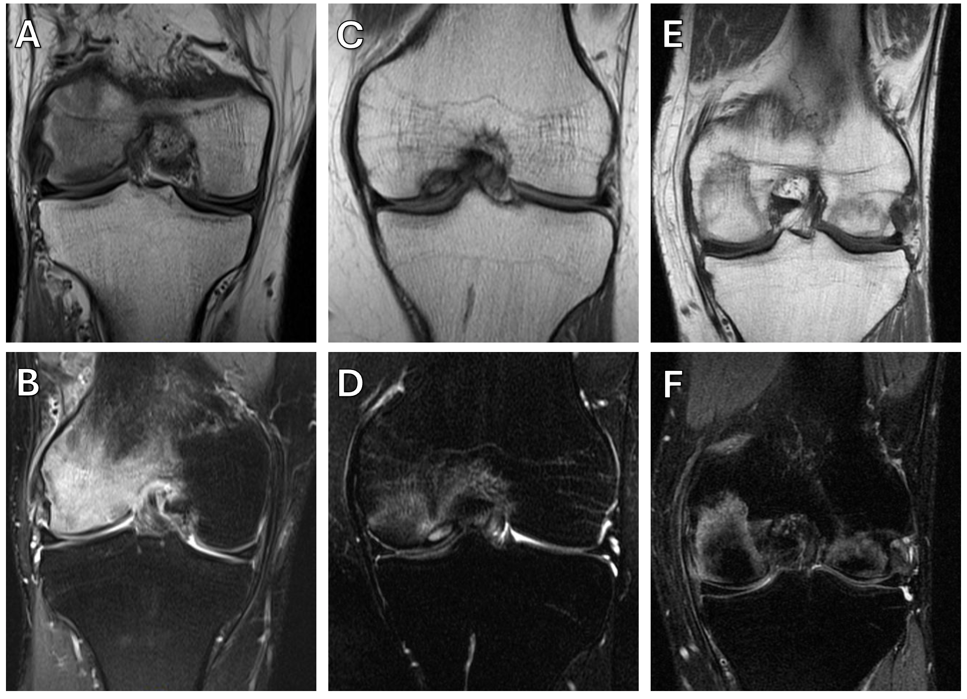 Die folgenden sechs MRT-Bilder zeigen drei Fälle mit edema-like marrow signal intensity der Femurkondylen, verursacht durch unterschiedliche Krankheitsprozesse.