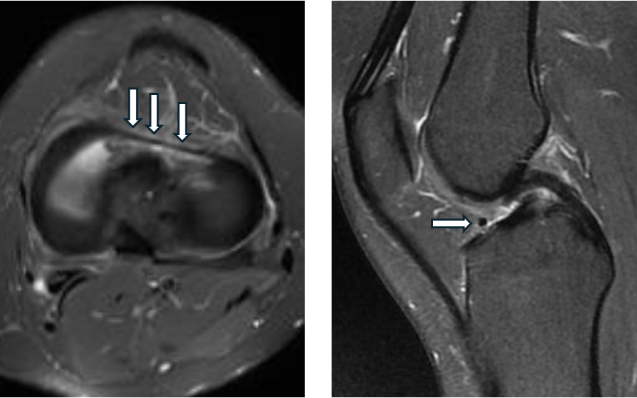 Welche Normvariante ist auf dem vorliegenden axialen und sagittalen PD-fs MRT-Bildern eines Knies mit Pfeilen gekennzeichnet?